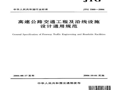 关于发布《高速公路交通工程及沿线设施设计通用规范》(JTGD80一2006)的公告现发布《高速公路交通.T.程及沿线设施设计通用规范》(.ITGD80一2006),自2006年10月1日起施行。