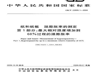 GB/T22899的本部分规定厂一种在相对湿度从(33士2)%【66士2)%平衡状态下测定纸和纸板吸湿膨胀率的方法。