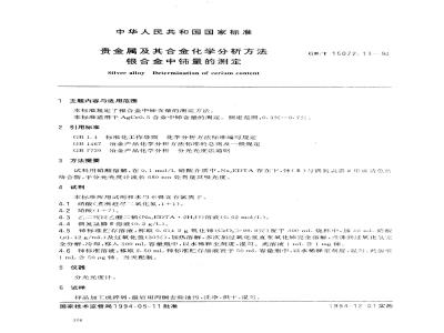 本标准规定了银合金中铈含量的测定方法。本标准适用于AgCe0.5合金中铈含量的测定。测定范围:0.3%~0.7%。 GB/T 15072.13-1994 贵金属及其合金化学分析方法 银合金中铈量的测定 GB/T15072.13-1994 标准下载解压密码:www.bzxz.net