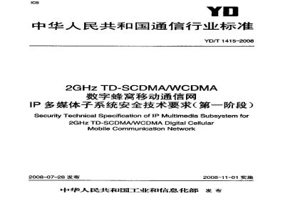 YD/T 1415-2008 2GHz TD-SCDMA/WCDMA数字蜂窝移动通信网IP多媒体子系统安全技术要求(第一阶段) YD/T1415-2008 标准下载解压密码:www.bzxz.net