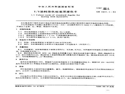 本标准适用于染料在进行染色牢度和染色性能测定试验时参照和目视评定染样的染色深度。本标准深度色卡的制订是参照ISO105-A01-1978推荐的DIN54000《1/1辅助色卡》的深度,并增加了金黄、红、翠蓝、艳绿四个色相。1规格和种类