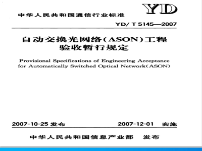 各省、自治区、直辖市通信管理局,中国电信集团公司、中国网络迪信集团公司、中国移动通信集团公司、中国联合通信有限公司、中国卫星通信集团公司、中国铁通集团有限公司,中国普天信息产业集团公司,中国通信建设总公司,中讯邮电咨询设计院:现将《自动交换光网络(ASON)工程验收暂行规定》(编号:YD/T5145一2007)发布,自2007年12月1日起实行。本规定由信息产业部综合规划司负责解释。本规定由北京邮电大学出版社负责出版发行。中华人民共和国信息产业部