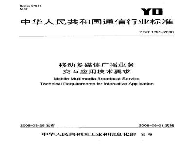 移动多媒体广播业务终端/卡设备测试方法(8)YD/T1790-2008移动多媒体广播业务应用层接口技术要求(9)YD/T1791-2008移动多媒体广播业务交互应用技术要求随着技术的发展,还将制定后续的相关标准。YD/T1791-2008
