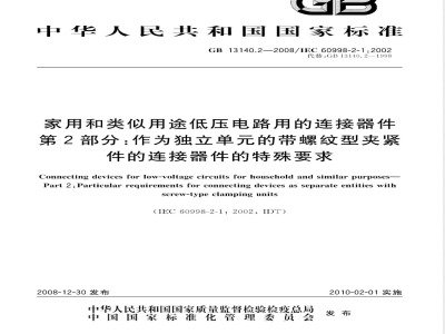 GB13140.1—2008的该章做下述变动后适用。增加:GB13140的本部分亦适用于连接未经特别处理的导线的带螺纹型夹紧件的连接器件。 GB 13140.2-2008 家用和类似用途低压电路用的连接器件 第2部分:作为独立单元的带螺纹型夹紧件的连接器件的特殊要求 GB13140.2-2008 标准下载解压密码:www.bzxz.net