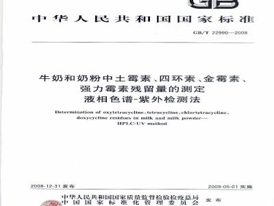 中文名称:牛奶和奶粉中土霉素、四环素、金霉素、强力霉素残留量的测定 液相色谱-紫外检测法