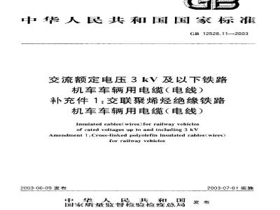 中文名称:交流额定电压3 kV及以下铁路机车车辆用电缆(电线)补充件1:交联聚烯烃绝缘铁路机车车辆用电缆(电线)