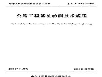 公路工程基桃动测投术规程一本运用动力检测方法评定公踏工程基完整件,承载力、试打拼及丹钟应力监控的行业标准。根据交通部公路发2000722号文,本规程中浙汀省交通厅工程质量监站主编,上海交通人学建筑工程学院,浙江价地球物理技术应研究所广东省交通建设工程版单检测中心,长沙理工大学公路工程试按检测中心上海市公路工程质量检测中心和福建省交泌建设工程试验检测中心等七家单位共同编,