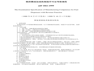 The Examination Specification of Manufacturing Competence for FuelDispensers with Revenue Function(1999年8月17日发布)(1999年10月1日实施)国家质量技术监督局发布