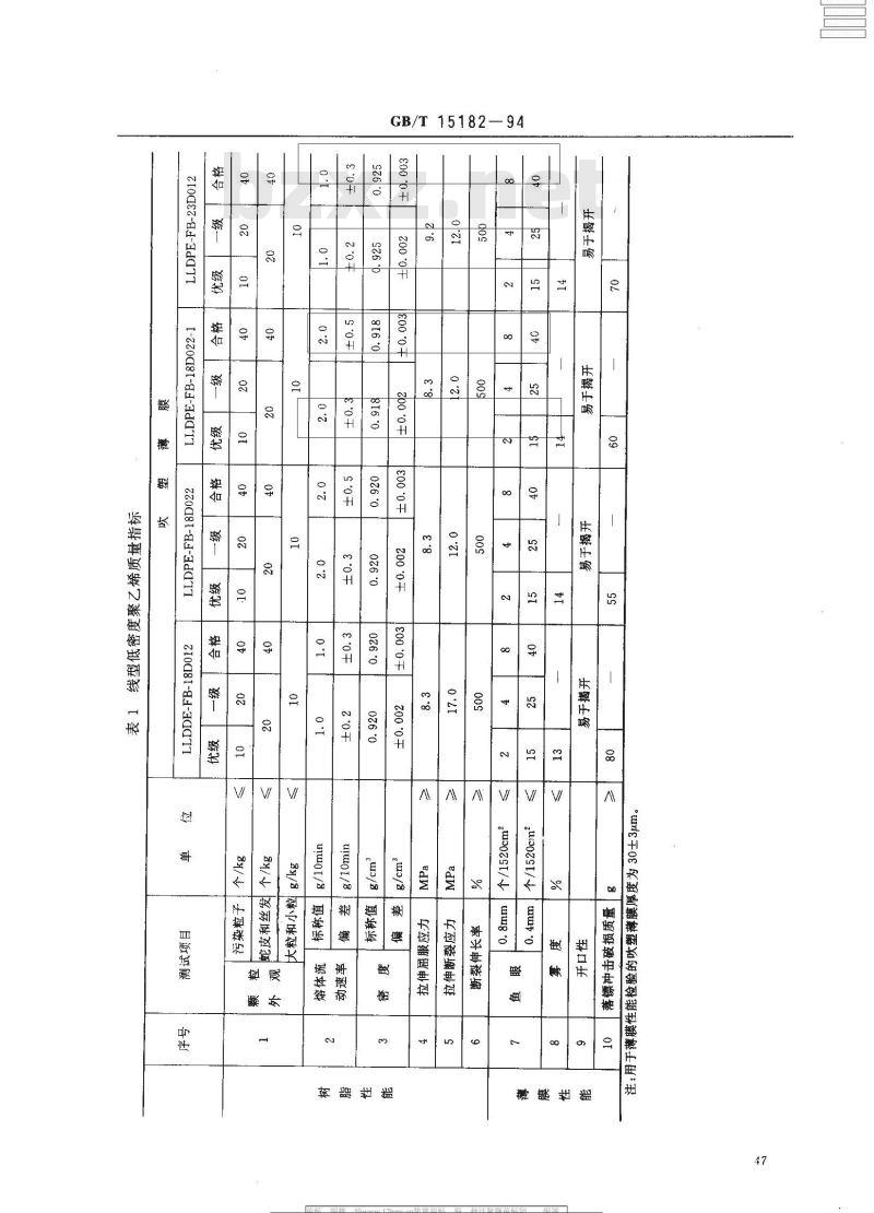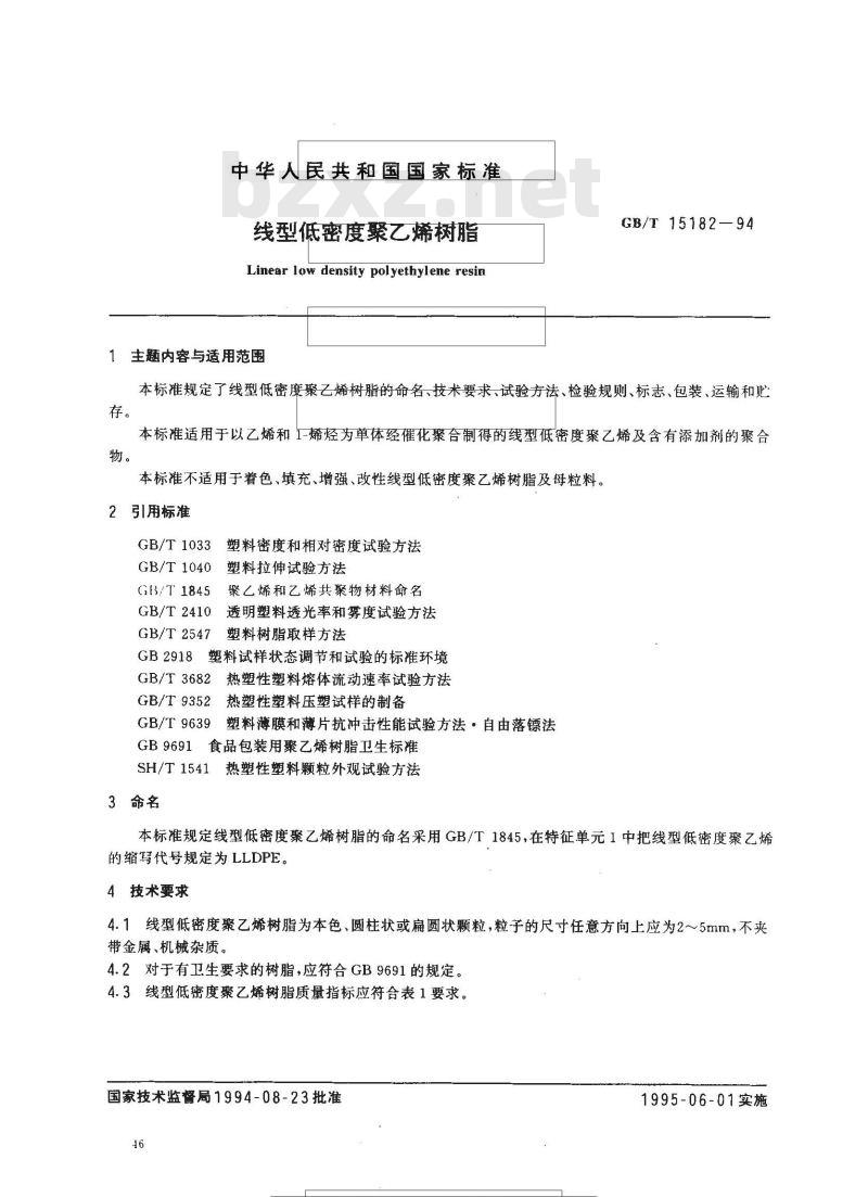 4.2对于有卫生要求的树脂,应符合GB9691的规定。4.3线型低密度聚乙烯树脂质量指标应符合表1要求。国家技术监督局1994-08-23批准46