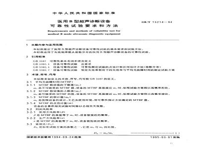 本标准规定了医用B型超声诊断设备可靠性试验的基本要求和试验方法。本标准适用于失效规律服从指数分布的医用B型超声诊断设备的可靠性试验。2引用标准