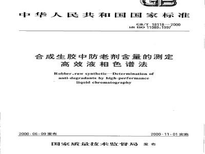 本标准等同采用国际标准ISO11089:1997《合成生胶一用高效液相色谱法测定防老剂》。本标准由中国石油化工集团公司提出。本标准由全国橡胶与橡胶制品标准化技术委员会合成橡胶分技术委员会归口。本标准起草单位,兰州石化公司化工研究院。本标准主要起草人:韩萍、翟月勤。GB/T18118—2000