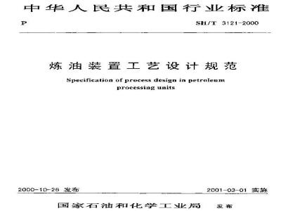 本规范适用于新建炼油装置的工艺设计,扩建或改建工程可参照执行。执行本规范时,尚应符合现行有关强制性标准规范的要求。 SH/T 3121-2000 炼油装置工艺设计规范(附条文说明) SH/T3121-2000 标准下载解压密码:www.bzxz.net