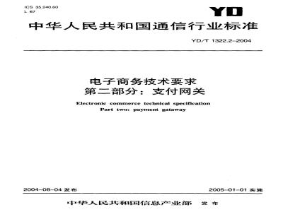 2.YD/T1322.2-2004《电子商务技术要求第二部分:支付网关》;3.YD/T1322.3-2004《电子商务技术要求第三部分:证书及认证系统》;4.YD/T1322.4-2004《电子商务技术要求第四部分:票据的表示层句法》。本部分的附录A为规范性附录。