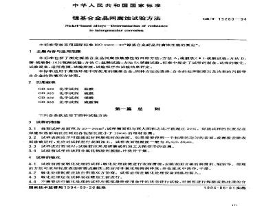 本标准包括了测定镍基合金晶间腐蚀敏感性的四种方法,方法A:硫酸铁(Ⅲ)-硫酸试验;方法B:铜?硫酸铜-16%硫酸试验;方法C:盐酸试验;方法D:硝酸试验。标准中规定了试样的制备、试样的敏化、试验设备、适用范围、试验溶液、试验程序和试验结果评定。本标准适用于腐蚀环境中所使用的镍基合金。四种方法的选择,合金的处理制度以及结果的判据等由合金的供需双方协商。 GB/T 15260-1994 镍基合金晶间腐蚀试验方法 GB/T15260-1994 标准下载解压密码:www.bzxz.net