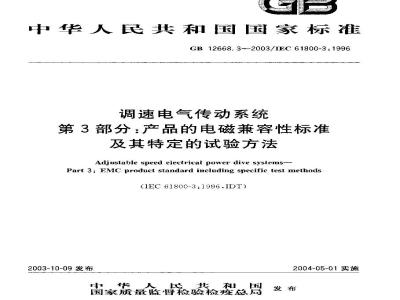 GB12668.32003/1EC61800-31996本部分的第三章抗扰度要求及第7章安全性的最低要求是强制性的,其余是维荐性的。本部分等同采用IEC61800-3:1996《调速电气传动系统第3部分:产品的电磁兼容性标准及其特定的试验方法》英文版)