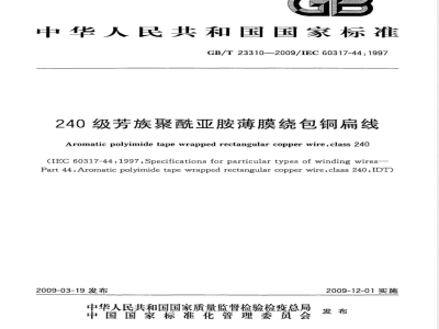 GB/T23310--2009/IEC60317-44:1997240级芳族聚酰亚胺薄膜绕包铜扁线本标准规定了240级芳族聚酰亚胺薄膜绕包铜扁线的要求,其中绝缘由一层或两层聚酰亚胺薄膜带组成。