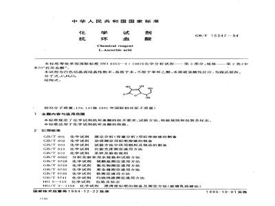 本标准规定了化学试剂抗坏血酸的技术要求、试验方法、检验规则和包装及标志。本标准适用于化学试剂抗坏血酸的检验。2引用标准