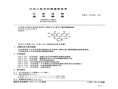 本标准规定了化学试剂溴甲酚绿的技术要求、试验方法、检验规则和包装及标志。本标准适用于化学试剂漠甲酚绿的检验。2、引用标准