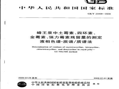 中文名称:蜂王浆中土霉素、四环素、金霉素、强力霉素残留量的测定 液相色谱-质谱/质谱法