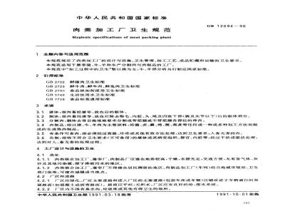 本规范规定了肉类加工厂的设计与设施、卫生管理、加工工艺、成品贮藏和运输的卫生要求。本规范适用于屠宰猪、牛、羊和生产分割肉与肉制品的工厂。本规范中“加工过程中的卫生”暂以猪为主,牛、羊部分将另行制定国家标准。 GB 12694-1990 肉类加工厂卫生规范 GB12694-1990 标准下载解压密码:www.bzxz.net