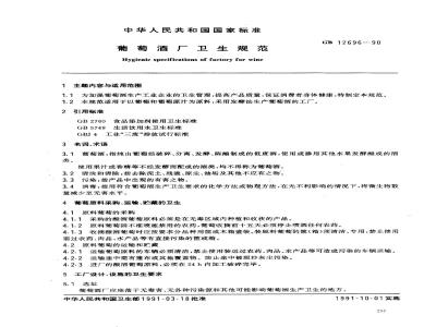为加强葡萄酒生产工业企业的卫生管理,提高产品质量,保证消费者身体健康,特制定本规范。本规范适用于以葡萄和葡萄原汁为原料,采用发酵法生产葡萄酒的工厂。 GB 12696-1990 葡萄酒厂卫生规范 GB12696-1990 标准下载解压密码:www.bzxz.net