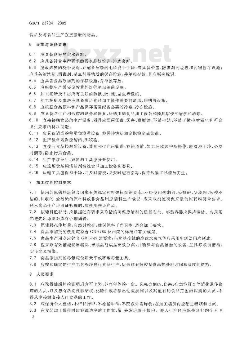 5.1生产场所周固应与有毒、有害场所以及其他污染源保持规定的距离,保证不受衬染源污染。5.2加1场所面积应与生产能力相适感,有足够的空闻利场地放置设备、物料和产品,并满足操作安全生产要求;加工场所布后应符合相应的生心加工流程要求,生食区与熟食区、原辅料利成品的存放场所应分开,避免交义污染,期!额所与生清区版保持规定距离。5.3加工场所池面、增面应平整,应采用水泥或瓷砖等硬质材料;墙面、地面应便于滑洗、消毒;增壁应有高度不低于1.5m的墙裙,且平整,防止污垢积存,便于清洗;窗户内窗台应便于消洁;顶部建造应防溺雨,防止灰尘积累、萨片脱落,并用容易清洁。5.4、产场所应消洁、平净、通风:不应有积水、泌泞、废弃物等易造成食品污染的因素。5.5应对厕所等污染源采取有效骗离揽施,防止污染食的。5.6应采取有效措施防止牛产场所利剧回区或内声虫滋生,行杀虫、杀菌操作时.不得污染原辅料、GB/T 23734—200S