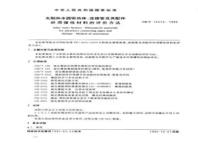 本标准规定了太阳热水器所用弹性材料老化前后及浸渍前后有关性能的评价方法。本标准适用于太阳热水器吸热体、连接管及其配件生产制造中所用弹性材料的评定。2引用标准