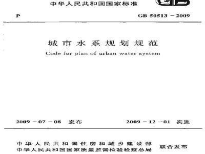 现批推《城市水系规势规范为国家标准,编号为GB505132009,自2009年12月1月起实施。其中,第4.2.3、4,3.4、5.2.2(4、5)、5.3.2,5.3、4、5.5.16.3.1、6.3.2、6.3.4茶(款)为强制性条文,必须严格执行。