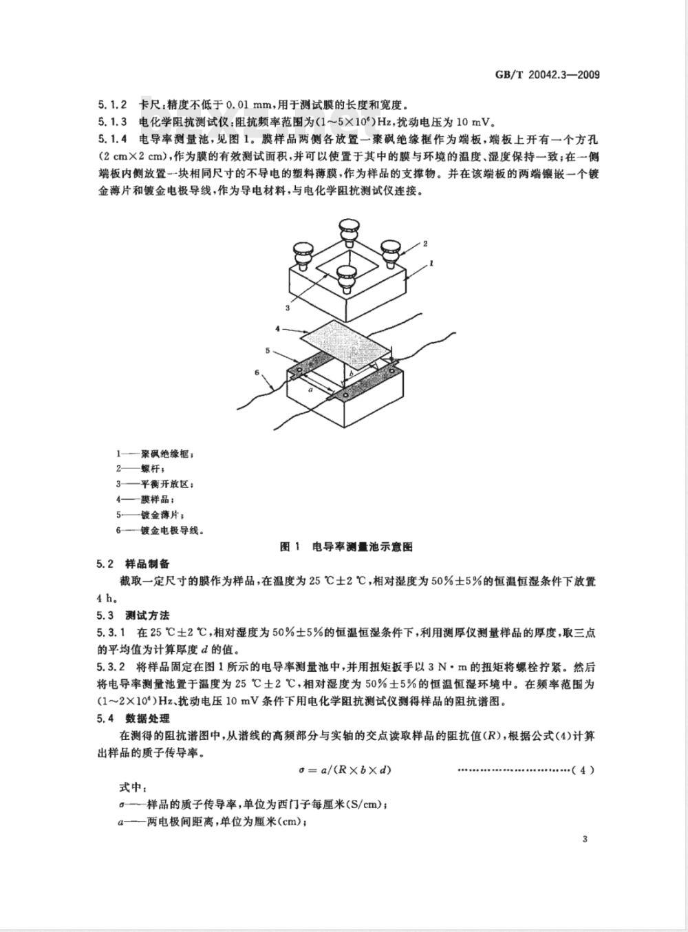 GB/T20042的本部分规定了质子交换膜燃料电池用质子交换膜测试方法的术语和定义、厚度均匀性测试、质子传导率测试、离子交换当量测试、透气率测试、拉伸性能测试、溶胀率测试和吸水率测试等。