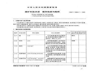 本标准规定了煤的成因与成因类型、煤层、含煤岩系与煤田、煤田地质勘探、地质编录与煤炭储量、煤矿地质与储量管理、煤矿水文地质、煤田钻探、煤田物探等术语。本标准适用于与煤田地质与勘探有关的所有文件、标准、规程、规范、书刊、教材和手册等。本标准规定的英文名称,仅供参考,不具有与汉语术语同等的约束力。煤的成因与成因类型