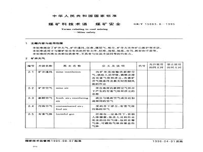 本标准规定了矿井大气、矿井通风、仪表、煤层气、粉尘、矿井火灾和矿山救护等术语。本标准适用于与煤矿安全有关的所有文件、标准、规程、规范、书刊、教材和手册等。本标准所列英文名称仅供参考,不具有与汉语术语同等的约束力。2矿井大气