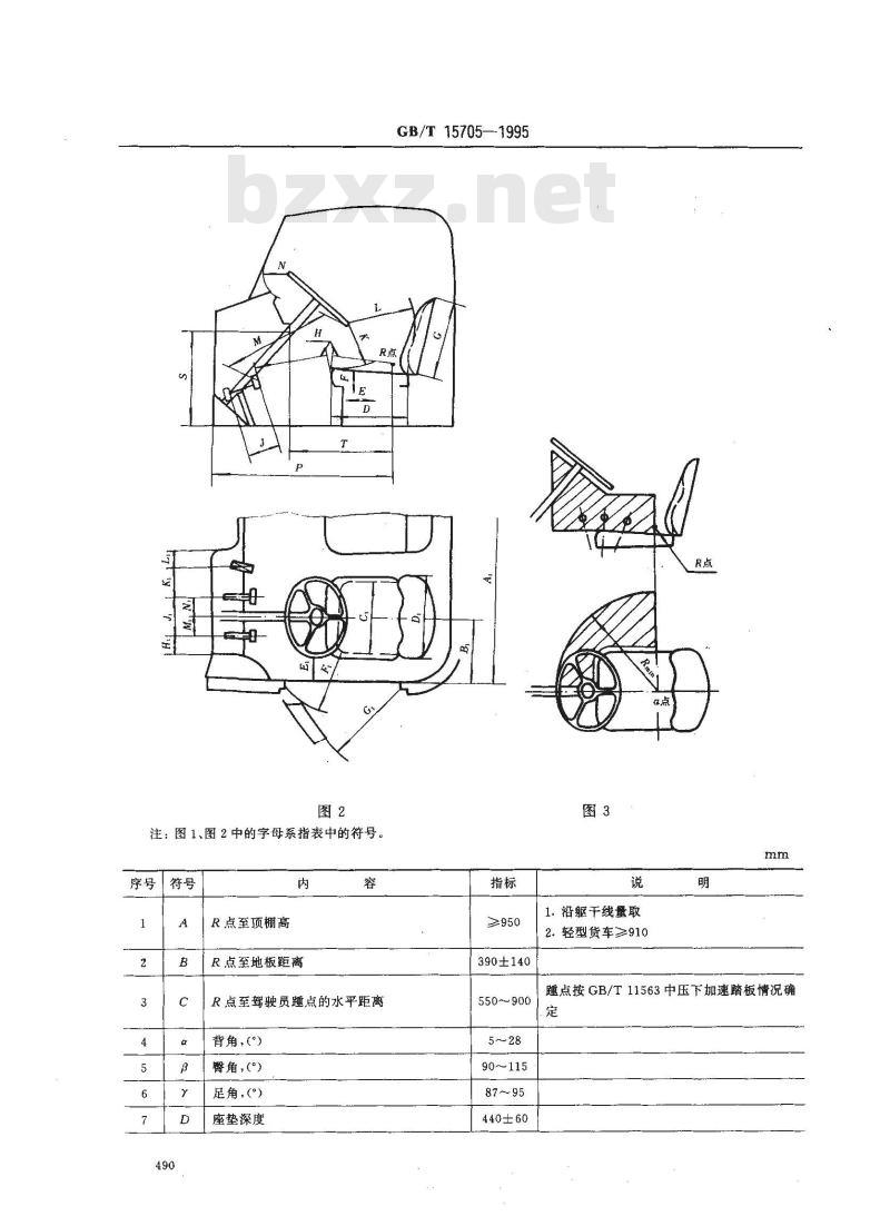 变速杆和手制动器的手柄在任意位置时,距驾驶室内其他零件或操纵杆的距离≥50注:①图中与R点及驾驶员睡点有关的尺寸及角度,是用三维H点人体装置确定的。②本标准中的座椅位置是按照座椅调整到最低最后位叠画出的。③本标准中的驾驶室轮廊系指驾驶室内侧表面。④本标推中的图是示意图,不决定驾驶室的型式和结构。③本标准系对左置转向盘驾驶室而言,右置转向盘驾驶室可以按此标准类推。附加说明: