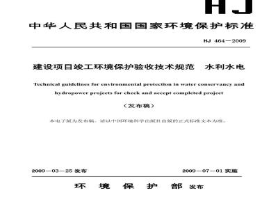 建设项目竣工环境保护验收技术规范水利水电本标准规定了水利水电建设项目峻工环境保护验收的技术工作程序和技术要求HJ464-2009