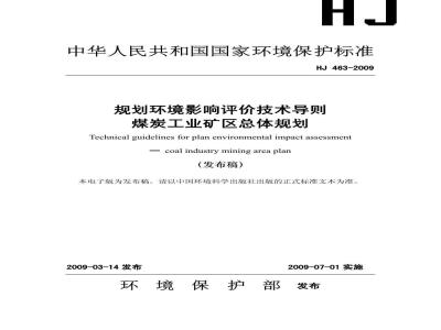 本标准规定了煤炭工业矿区总体规划环境影响评价的一般原则、内容、方法和要求。本标准适用于国务院有关部门、设区的市级以上人民政府及其有关部门组织编制的煤炭工业矿区总体规范环境影响评价。煤、电一体化,煤、电、化工一体化等专项规划环境影响评价中的煤炭开发规划环境影响评价可参照本标准执行。 HJ 463-2009 规划环境影响评价技术导则 煤炭工业矿区总体规划 HJ463-2009 标准下载解压密码:www.bzxz.net