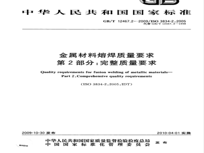 第5部分:满足质量要求应依据的标准文件。本部分为GB/T12467的第2部分。GB/T12467.2—2009/IS03834-2:2005本部分等同采用ISO3834-2:2005《金属材料熔焊质量要求交第2部分:完整质量要求》(英文版)。本部分等同翻译ISO3834-2:2005。为了便于使用,本部分做了下列编辑性修改:删除了国际标准的前言;