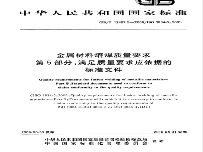 一第5部分:满足质量要求应依据的标准文件。本部分为GB/T12467的第5部分。GB/T12467.5—2009/IS03834-5:2005本部分等同采用IS03834-5:2005《金属材料熔焊质量要求:第5部分:确认符合ISO3834-2、ISO3834-3或ISO3834-4质量要求所需的文件》(英文版)。本部分等同翻译ISO3834-5:2005。为了便于使用,本部分做了下列编辑性修改:删除了国际标准的前言;
