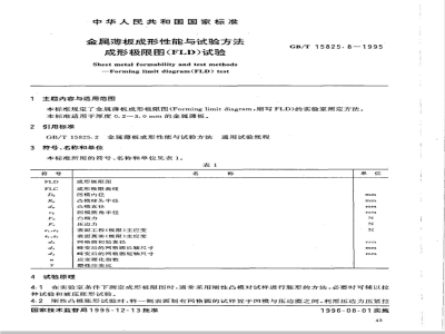 本标准规定了金属薄板成形极限图(Forming limit diagram,缩写FLD)的实验室测定方法。本标准适用于厚度0.2~3.0 mm的金属薄板。 GB/T 15825.8-1995 金属薄板成形性能与试验方法 成形极限图(FLD)试验 GB/T15825.8-1995 标准下载解压密码:www.bzxz.net