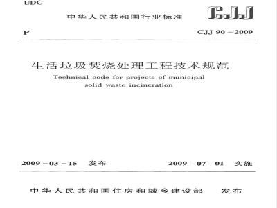 现批准《生活垃圾焚烧处理工程技术规范》为行业标准,编号为CJJ90-2009,自2009年7月1日起实施。其中,第3.1.1、4.2.1、5.2.6、5.3.2、5.3.4、6.2.2、6.2.5、6、5.2、7.3.2、7.6.6、10.2.5、10.3.4、10.4.5、10.5.1、12.3.9、16.2.10条为强制性条文,必须严格执行。原行业标准《生活垃圾焚烧处理工程技术规范》CJJ902002同时废止。本规范由我部标准定额研究所组织中国建筑工业出版社出版发行。