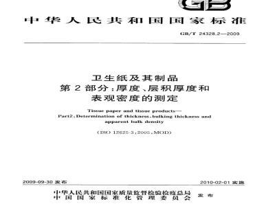 GB/T24328的本部分规定了卫生纸及其制品的厚度、层积厚度的测定方法,以及表观密度的计算方法,测定压力为2.0kPa。