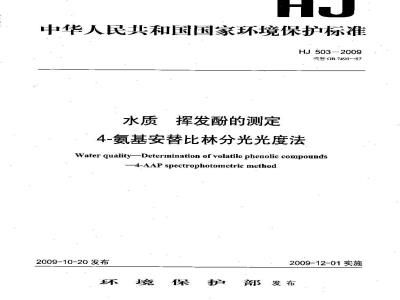 一、《水质总有机碳的测定燃烧氧化-非分散红外吸收法》(HJ501一2009);二、《水质挥发酚的测定化容量法》(HJ502一2009);一、《水质挥发酚的测定4氨基安替比林分光光度法》(HI503一2009);四、《环境空气臭氧的测定靛蓝二磺酸钠分光光度法》(HJ504一2009):五、《水质五门生化需氧量(BODs)的测定稀释与接种法》(HI505—2009);六、《水质溶解氧的测定电化学探头法》(HJ506—2009)。以上标准自2009年:12月1日起实施,由中国环境科学出版社出版,标准内容可在环境保护部网站(bz.mep.gov.cn)查询。