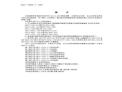 GB/T16262—1996代替1S088241:1990GB/T162631996代替ISO8825:1990,GB/T 15536-1995 代替ISO 9069:1986;b)根据编写国家标推的基本规定,本标推保留了被采用国际标准的前言,同时增加“前言”)原文第2章中,关于IS()8824:1987和IS08825:1987的两个补篇,已被新版IS)8824:1990和ISO 8825:1990取代,而GB/T16262—1996和GR/T16263—1996分别等同采用ISO8824:1990种ISO8825:1990.所以本标准中将两个补篇删。GB/T15936在《信息处理文本和办公系统办公文件体系结构和交换格式\总标题下,耳前包括以下八个部分;