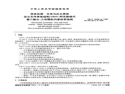 GB/T 15936的这一部分有以下±要内容;规定能与GB/T15936.2中规定的文件体系结构·起使用的几何图形内容休系结构:规定接,该接口允许在按GB/T15936.2构成的文件内,使用GB/T15121构造的内容,规定在基本布局客体中能用于该几何图形内容体系结构显现的定位和成像的外观一规定了能用丁该几何图形内容体系结构的显现属性;一描述一个内容布过程。它与GB/T15936.2中描述的文件布局过程一起,描述「在基本布局客休中儿何图形内容的布局,开确定这些基本布局客体的尺寸。2引用标准