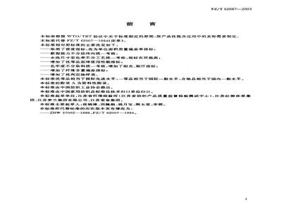 本标准根据WTO/TBT协议中关于标准制定的原则,按产品性能及应用中的实际需要制定。本标准代替FZ/T62007—1994《床单》。本标准相对原标准的主要改变如下:取消了密度指标,改为单位面积质量偏差率指标;断裂强力不分经纬向统一考核;水洗尺寸变化率不分工艺统一考核,指标有所提高;增加了优等品起球使用性能指标;色牢度不分染料统一考核,增加了耐光、耐汗指标;增加了纤维含量偏差指标;