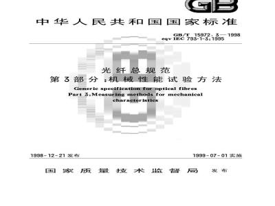 GB/T15972—1998在《光纤总规范》总标题下包括五个部分:第1部分(即GB/T15972.1):总则第2部分(即GB/T15972.2):尺寸参数试验方法第3部分(即GB/T15972.3):机械性能试验方法第4部分(即GB/T15972.4):传输特性和光学特性试验方法第5部分(即GB/T15972.5):环境性能试验方法本标准是第3部分。