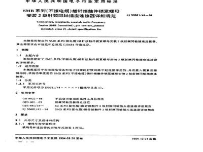 SJ 50681.44-1994 SMB系列(不接电缆)插针接触件锁紧螺母安装2级射频同轴插座连接器详细规范