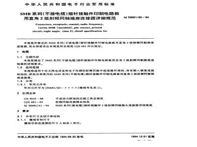 中华人民共和国电子行业军用标准SMB系列(不接电缆)插针接触件印制电路板用直角2级射频同轴插座连接器详细规范Connectors,receptacle,coaxial,radiofrequency,(series SMB(uncabled),pin contact,printedcircuit, reght angle, class 2),detail specification forSJ50681/60-94