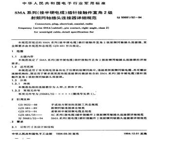 本规范所规定的SMA系列(接半硬电缆)插针接触件直角2级射频同轴插头连接器,其全部要求由本规范和总规范GJB681作出规定。1范围