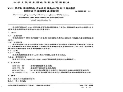 本规范所规定的TNC系列(接半硬电缆)插针接触件直角2级射频同轴插头连接器,其全部要求由本规范和总规范GJB681作出规定。1范阁