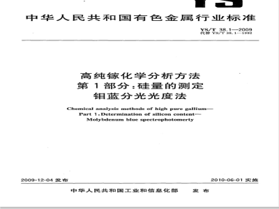 YS/T38《高纯镓化学分析方法》分为两个部分:第1部分:《高纯镓化学分析方法硅量的测定钼蓝分光光度法》;YS/T38.1—2009