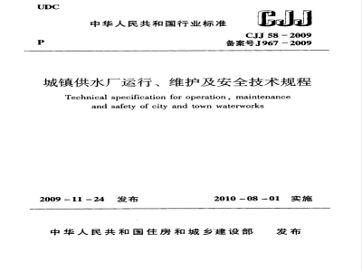 现批准《城镇供水广运行、维护及安全技术规程》为行业标准,编号为CJJ58-2009,自2010年8月1日起实施。其中,第2.1.4、2.2.1、2.7.1、2.8. 6、3.1.2、3.1.4、4.1.1、4.1.3、4.13.2、4.13.4、9.1.1、9.1.5、9.2.2、9.2.3、9.3.1、9.3.2、9.3.3、9.3.4、9.3.5、9.3.7、9.3.8、9.3.9、9.3.11、9.3.12、9.3.13、9.3.14、9.3.16、9.4.1、9.4.39.5.2、9.5.5、9.5.6、9.5.8、9.5.9、9.5.10条为强制性条文,必须严格执行。原《城镇供水厂运行、维护及安全技术规程》CJ58-94同时废止。·